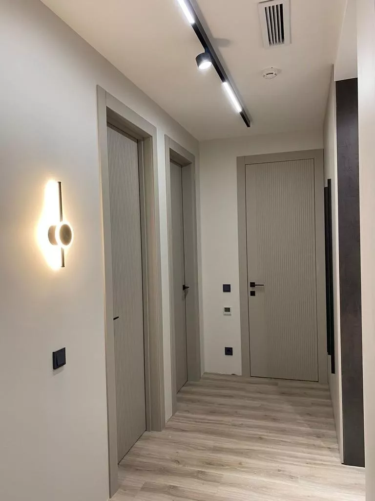 - Современный стиль: Полотна на компланарном коробе (плоскость наличника совпадает с плоскостью полотна) или скрытом коробе (без декоративного наличника) с трендовыми фрезеровками или небольшими стеклянными вставками.
